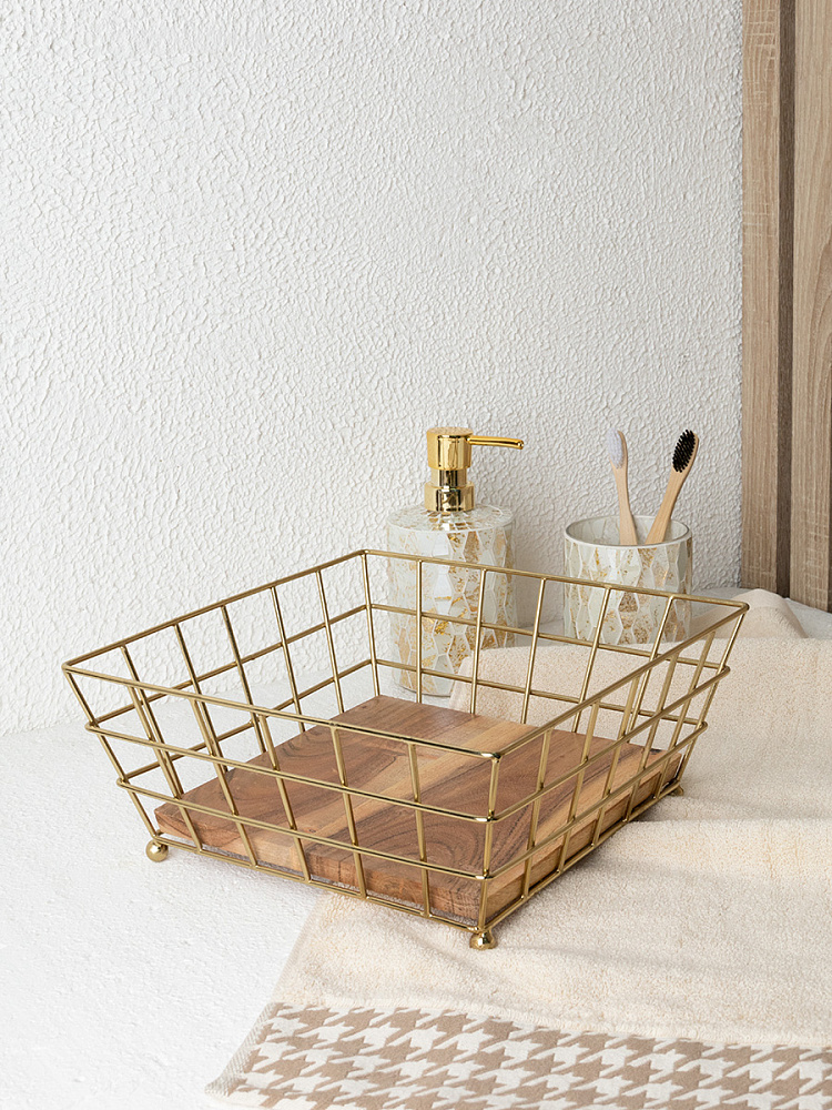 Корзина для хранения 25x25x11 золотой сталь с порошковым покрытием/дерево акации